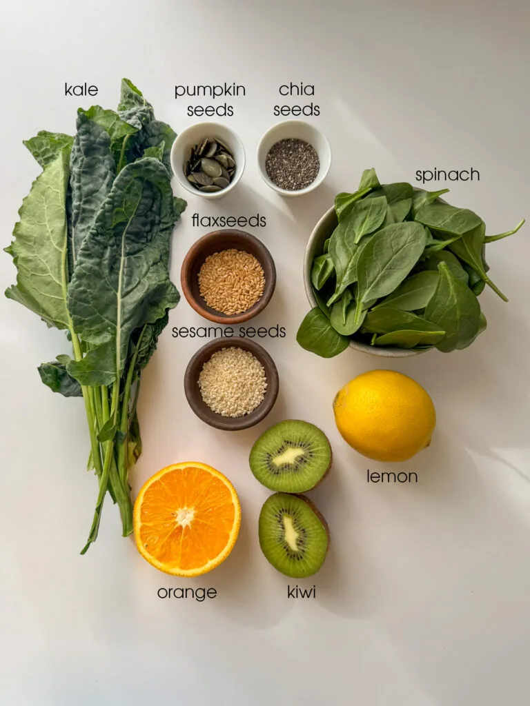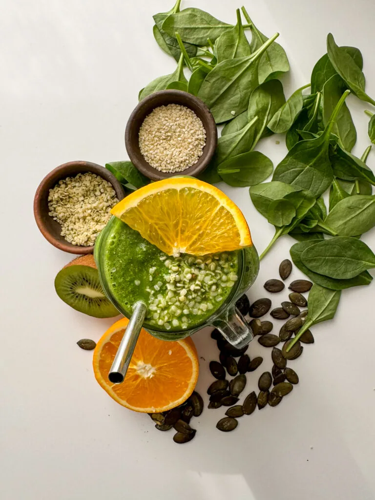 Struggling with low iron or fatigue? This nutrient-packed smoothie blends iron-rich greens with vitamin C from orange and kiwi for optimal absorption. Plus, the mix of super seeds provides extra minerals and healthy fats, making it a delicious and refreshing drink to enjoy any time you need a natural energy boost!