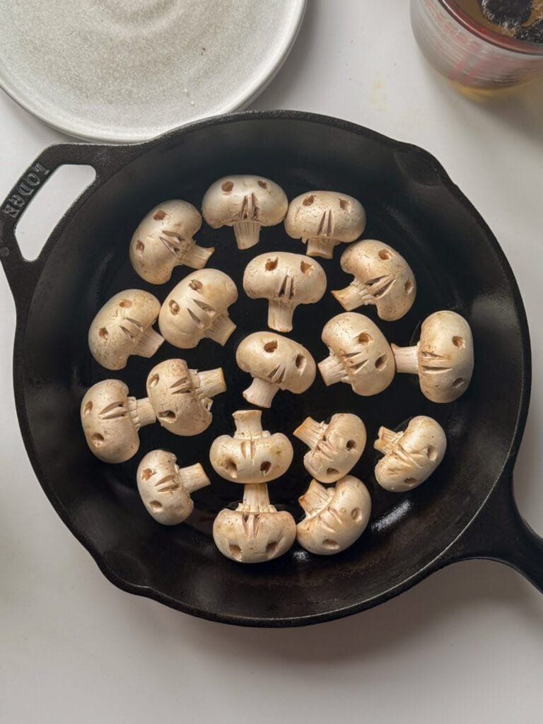 Heat a cast-iron or shallow pan over medium-high heat. Add a small drizzle of neutral oil if needed, and cook the mushrooms cut side down until golden brown and lightly crisp. Remove and set aside.