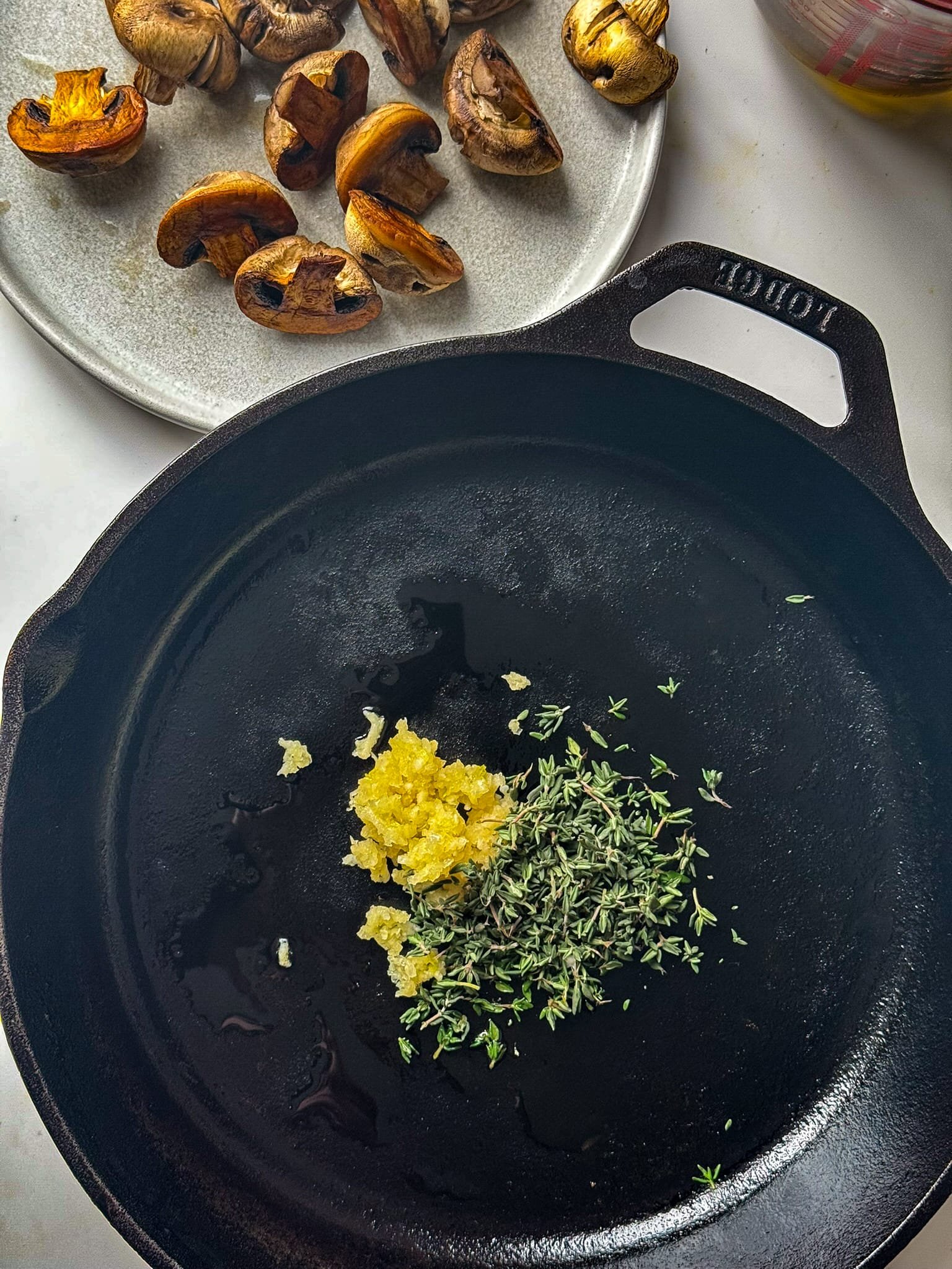 In the same pan (no need to wash it), add the garlic and thyme leaves. Sauté for 1–2 minutes until fragrant.
