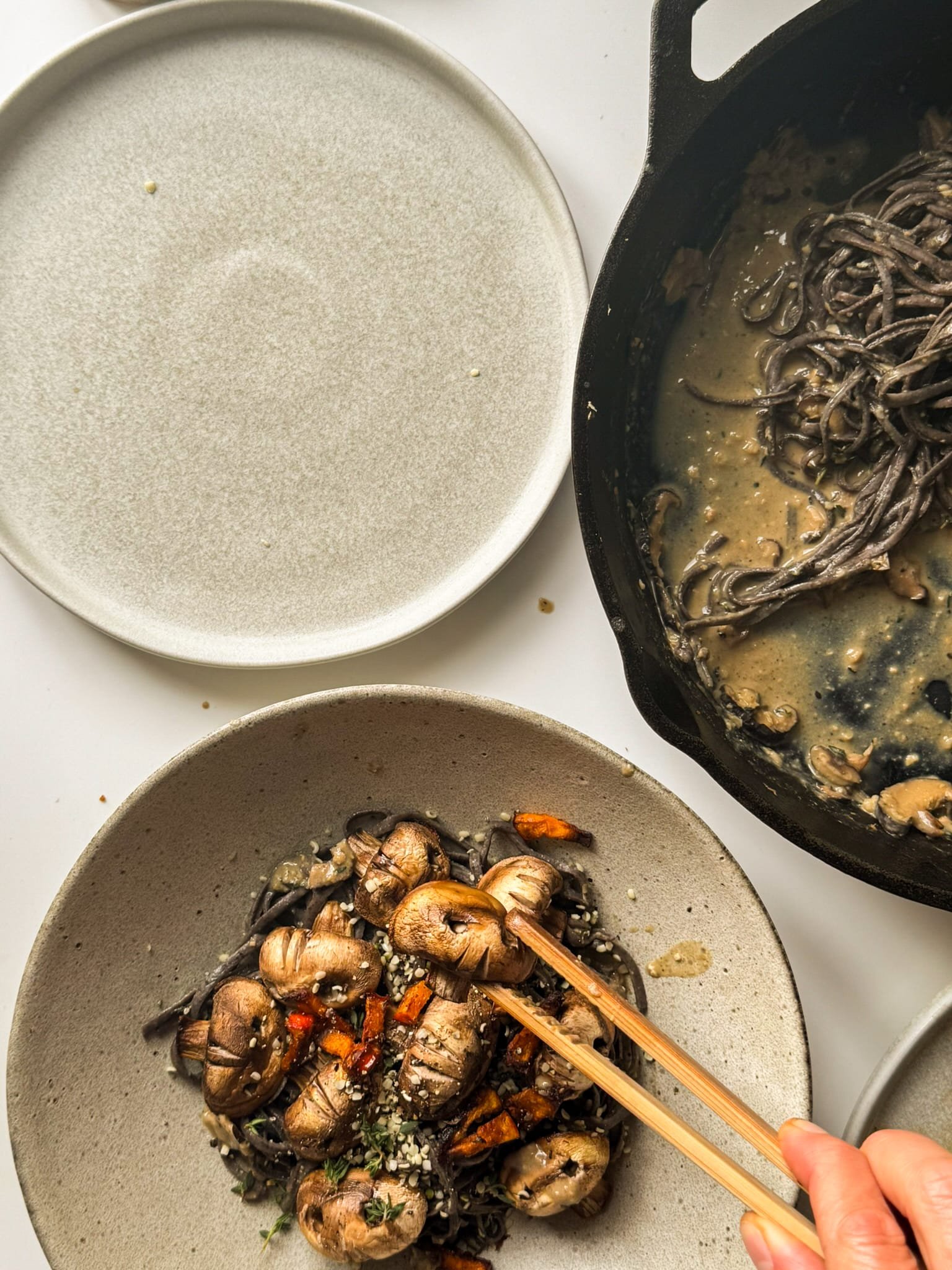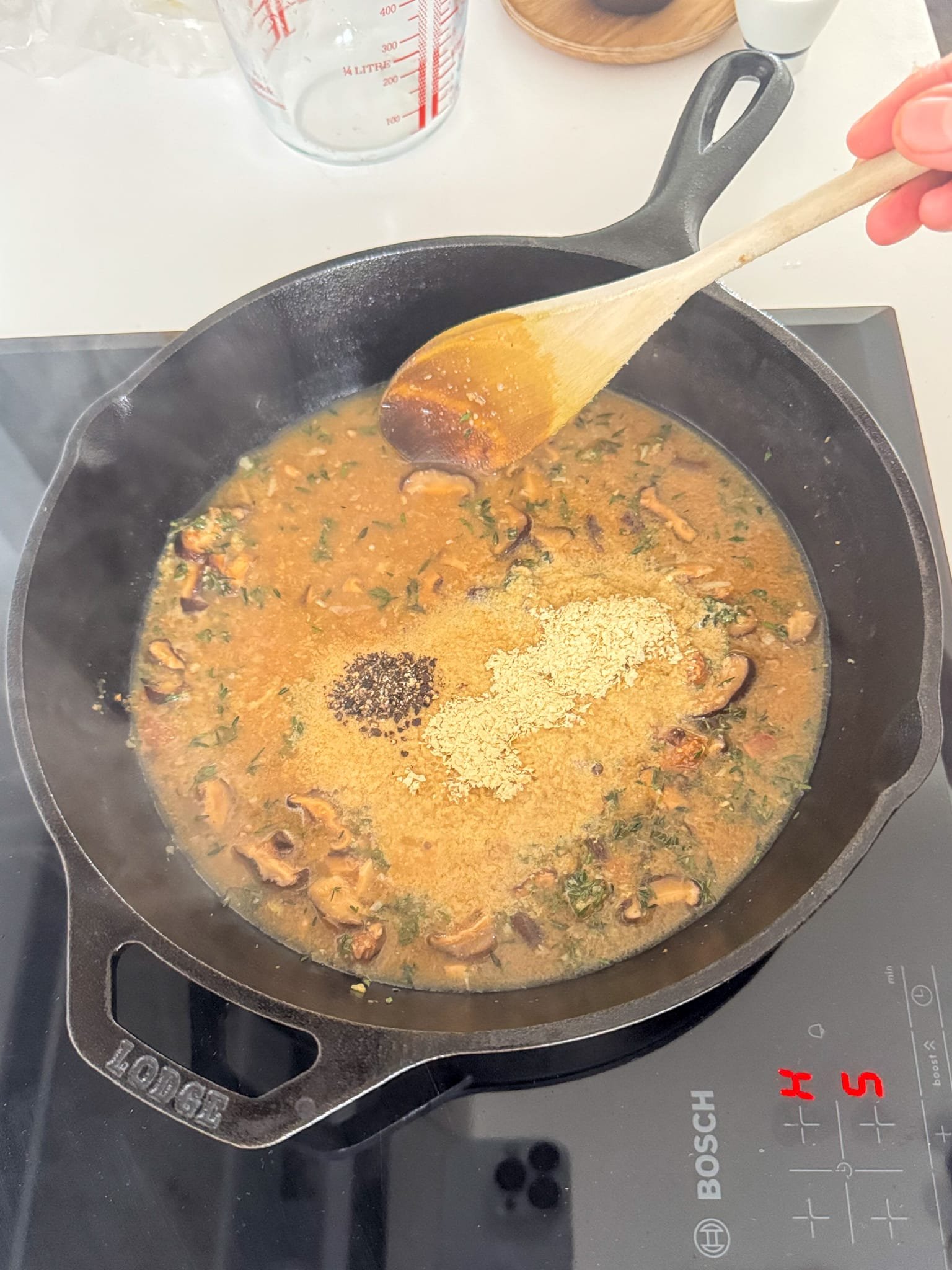 Deglaze the pan with a splash of mushroom broth. Stir in the miso paste, black pepper, chopped dried mushrooms, nutritional yeast, and more broth as needed. Let it simmer gently for 2–5 minutes to thicken slightly.