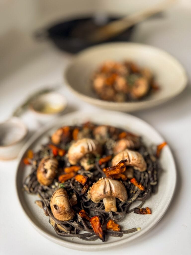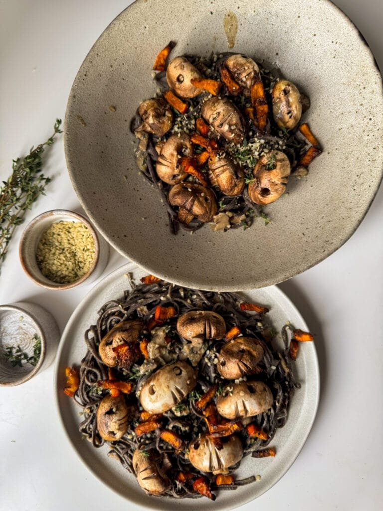 - ServeDivide the pasta between plates and top with the mushroom skulls, roasted pumpkin “worms”, hemp hearts, and a sprinkle of fresh coriander or parsley. Finish with freshly cracked black pepper and serve right away.