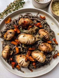 This high-protein black bean spaghetti is as delicious as it is haunting! 🍝💀 Topped with cute mushroom skulls in a savoury miso-thyme sauce, it’s fun to make with kids and packed with plant protein and fibre. Add peas or roasted pumpkin ‘worms’ for extra colour — healthy, hearty, and totally vegan!