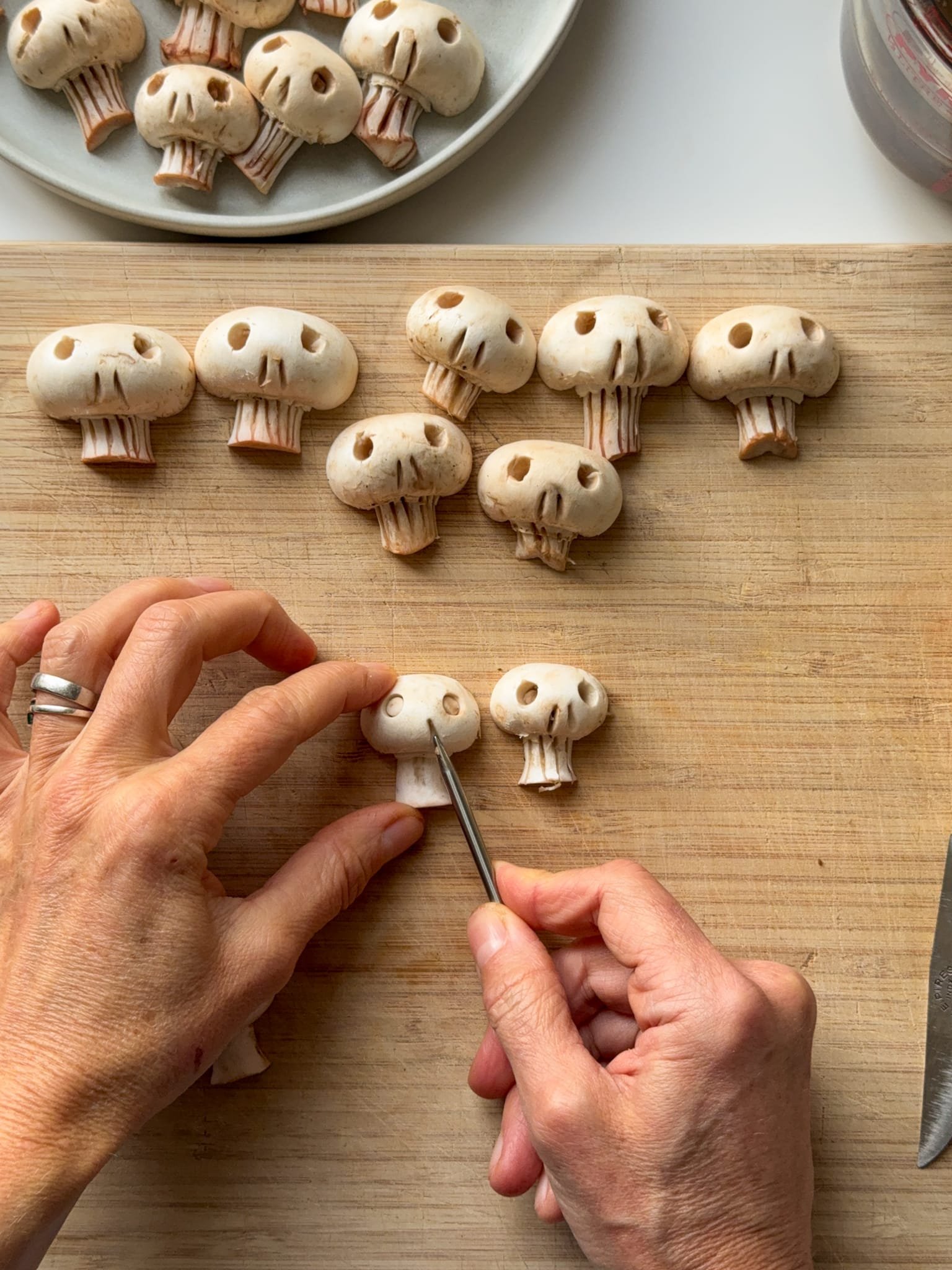 Slice the mushrooms in half. Use a straw to poke two small holes for the eyes, then pinch a little “nose” using a toothpick or skewer. Carve a few light vertical grooves down the stalk to resemble bones.