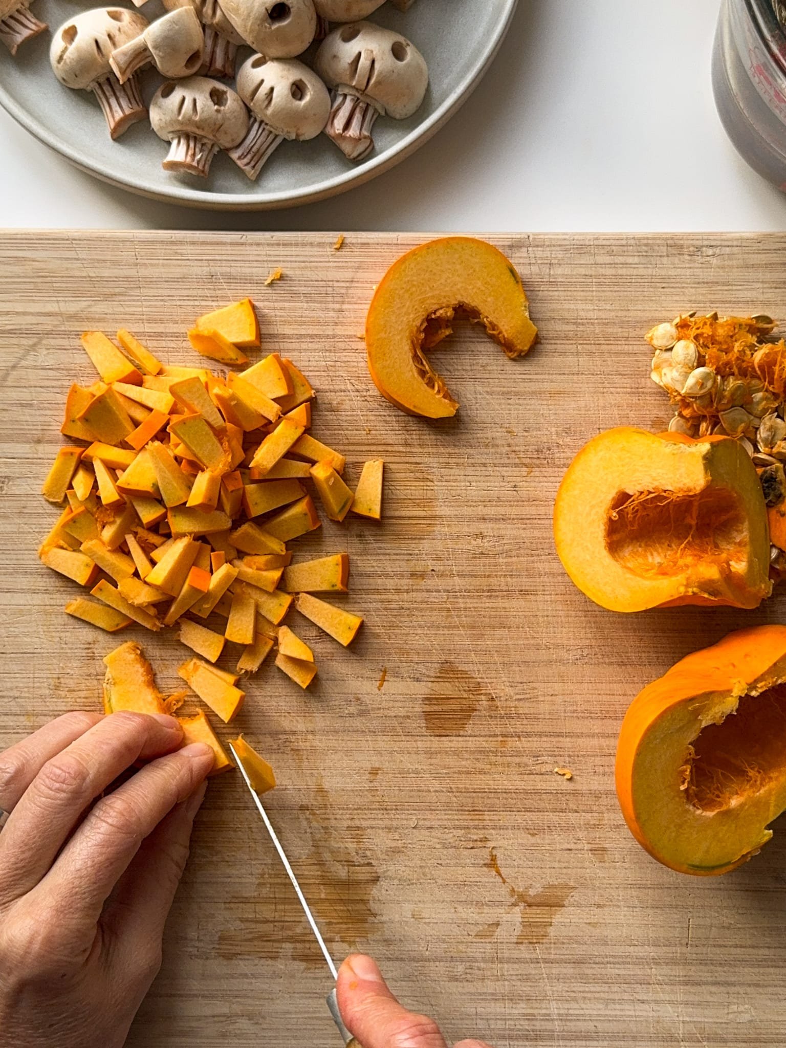 Cut the pumpkin or squash into thin, worm-like strips. Toss with a few drops of olive oil and a pinch of black pepper, then bake for 12–15 minutes at 170°C (fan oven preheated) until golden and tender.