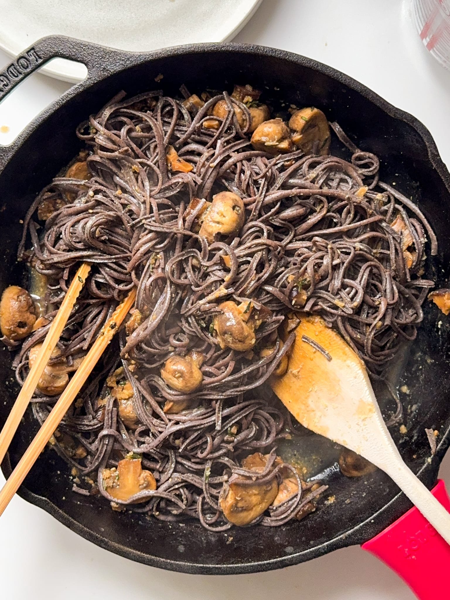 Add the cooked black bean spaghetti to the sauce and toss until evenly coated and glossy.