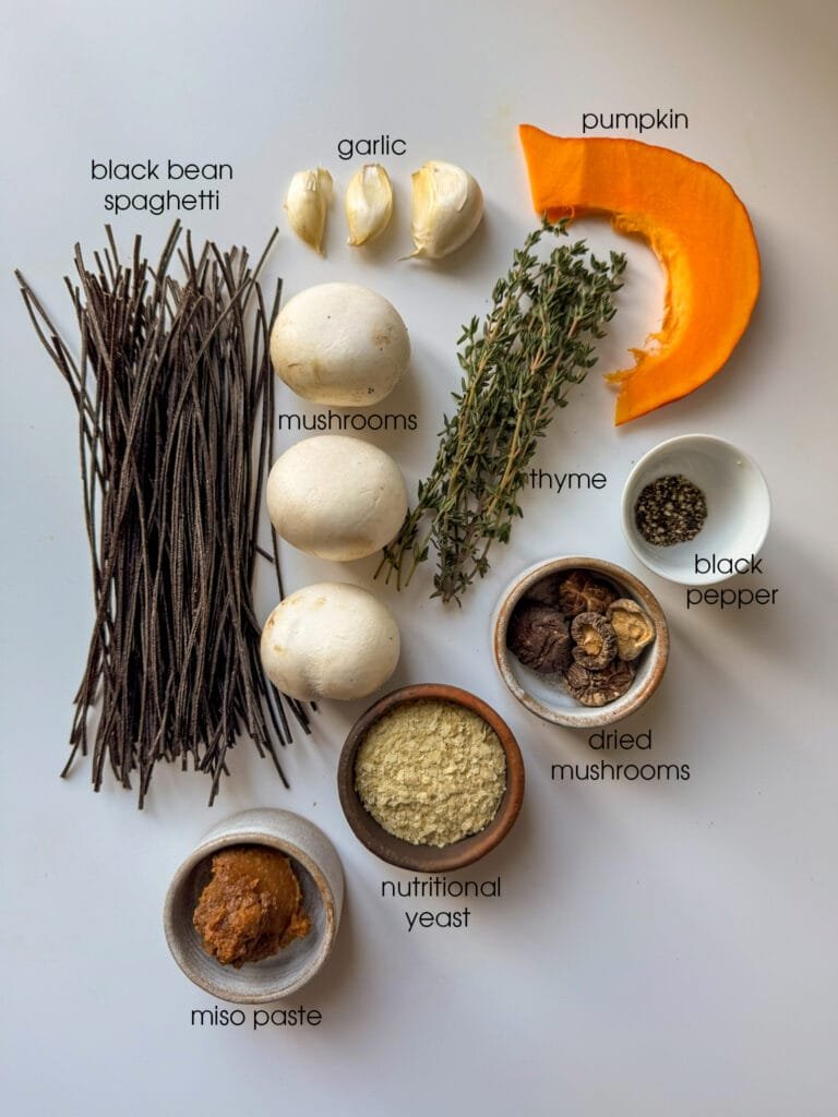 - Cook the Aromatics In the same pan (no need to wash it), add the garlic and thyme leaves. Sauté for 1–2 minutes until fragrant.Meanwhile, slice the rehydrated dried mushrooms and start cooking the black bean spaghetti according to the packet instructions.